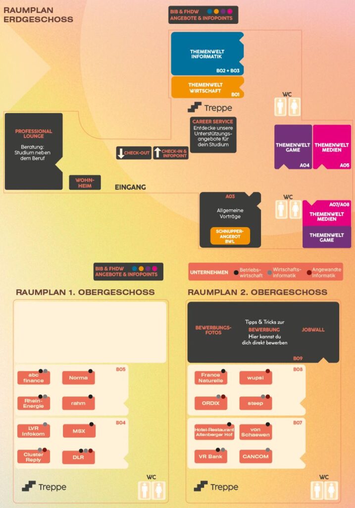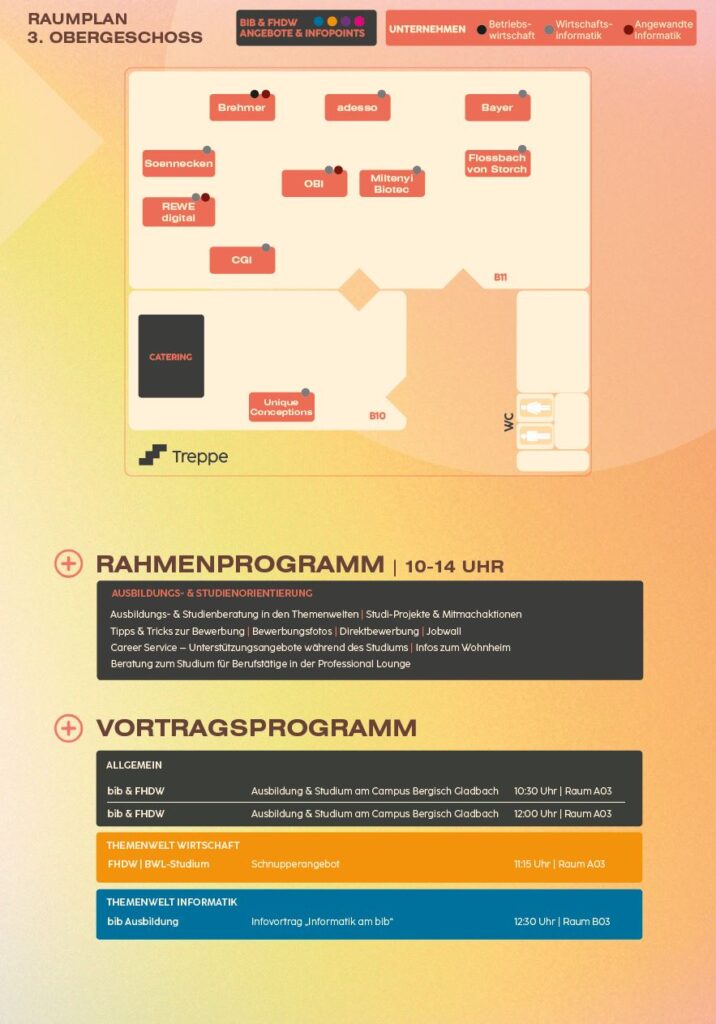 - Networking & Karriere: Knüpfe Kontakte zu Unternehmen, Alumni und Dozent*innen und erfahre direkt, welche Perspektiven Ausbildung oder Studium dir eröffnen.
